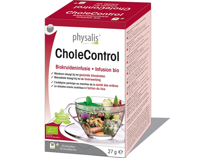 Physalis CholeControl biokruideninfusie bevat mariadistel en kurkuma die bijdragen tot een goede leverwerking en het vetmetabolisme. Gember en pepermunt ondersteunen de intestinale werking. Meidoorn draagt bij tot gezonde bloedvaten. Zacht en aangenaam van smaak.