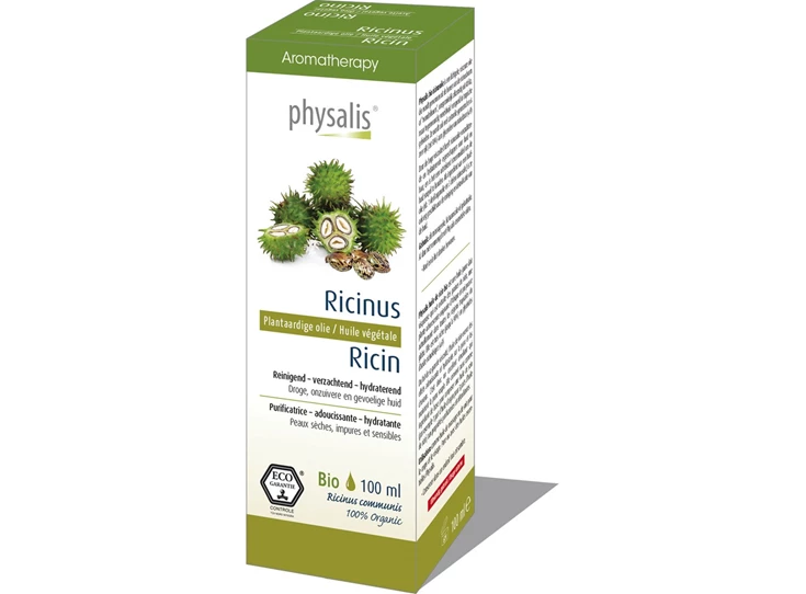 Physalis bio ricinusolie is een lichtgele, visceuze olie die wordt gewonnen uit de bonen van de ricinusboom of “wonderboom”, oorspronkelijk afkomstig uit Afrika, maar tegenwoordig wereldwijd verspreid in tropische gebieden. Ze wordt ook wel castorolie genoemd en is zeer rijk (tot 90%) aan glyceriden van ricinolzuur (?9). Door de hoge viscositeit heeft ricinusolie verzachtende en hydraterende eigenschappen voor huid en haar, en is het een uitstekend smeermiddel om de huid soepel te houden. Als ingrediënt van een huidolie (vb. 1 deel arganolie en 3 delen ricinusolie) is ze ook erg geschikt voor de reiniging en detoxificatie van de huid.