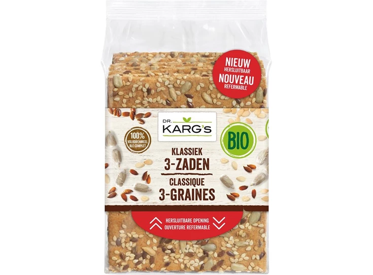 Alle crackers van Dr. Karg's zitten in een gerecyclede verpakking.
