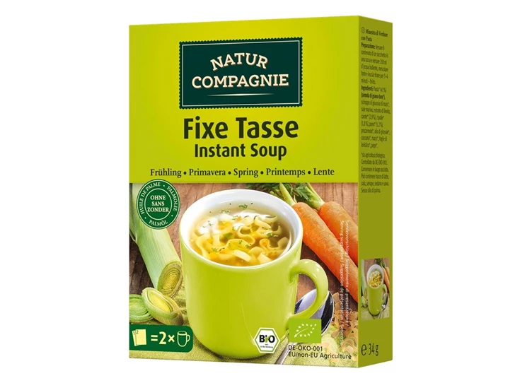 Goedgevulde instant lentesoep van Natur Compagnie, boordevol pasta en verschillende frisse groenten.