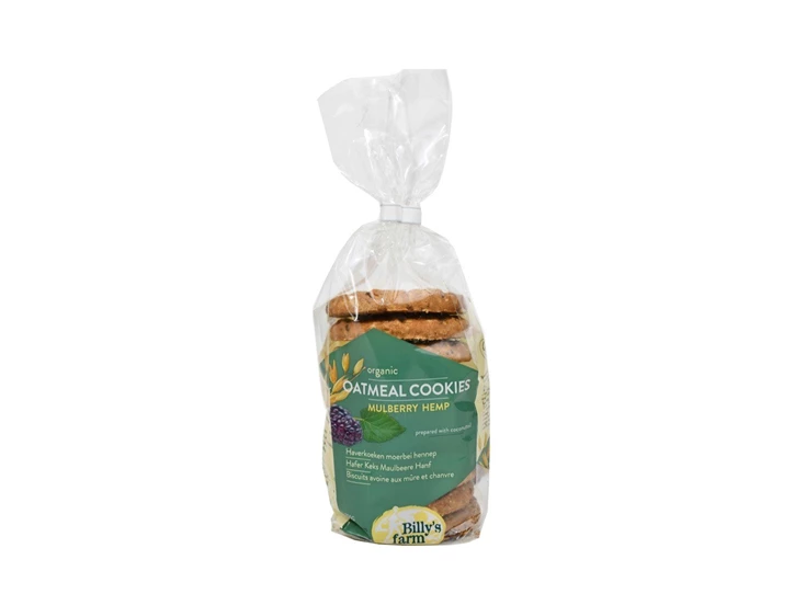 De haverkoeken moerbei hennep van Billy's Farm zijn vegan en gezoet met koksbloesemsiroop.