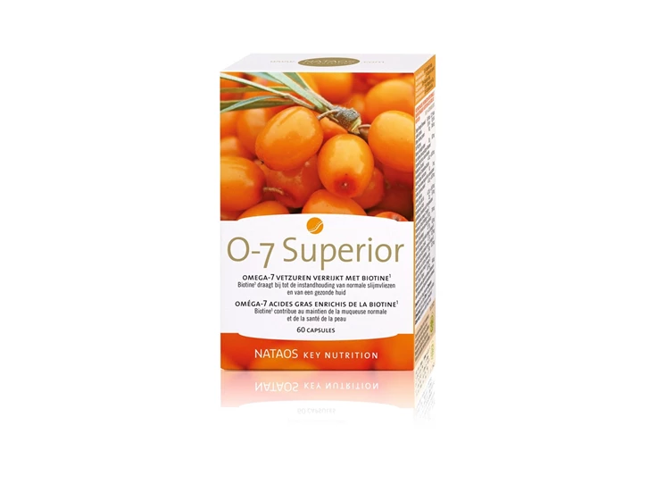 Nataos O-7 Superior van duindoorn heeft een hoog gehalte aan Omega-7. O-7 Superior bevat ook vitamine E en biotine, essentiële voedingsstoffen die bijdragen tot de instandhouding van normale slijmvliezen en een gezonde huid. Biotine is daarnaast ook van belang voor het haar en vitamine A draagt bij tot de instandhouding van een gezond gezichtsvermogen. De olie uit de bessen bevat een volledig spectrum vitamine E, zowel tocoferolen als tocotriënolen, nutriënten waarvan is bewezen dat zij een belangrijke rol spelen bij de bescherming van de lichaamscellen tegen oxidatieve stress.