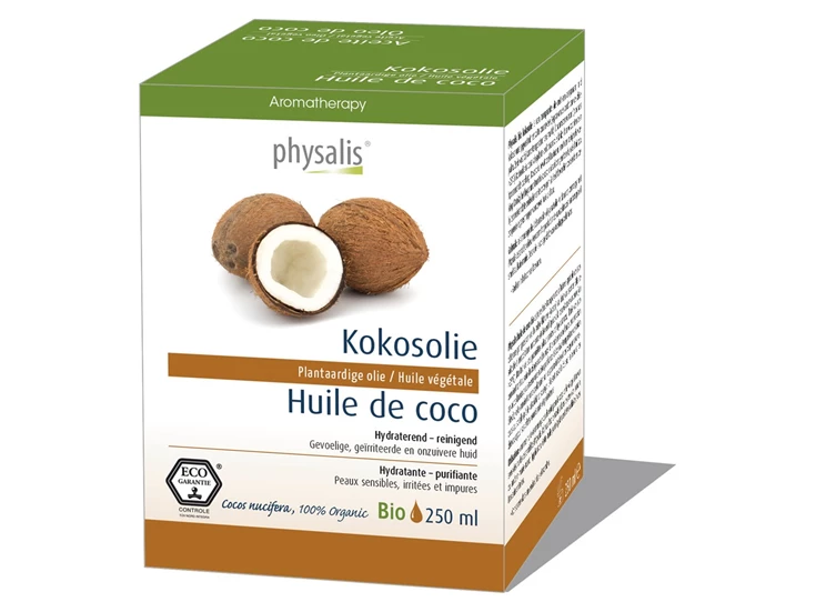 Physalis bio Kokosolie is een transparante olie met een aangenaam, mild kokosaroma geperst uit het witte vruchtvlees (copra) van de vrucht van de kokospalm. Ze is vast bij kamertemperatuur en smelt bij lichaamstemperatuur (vloeibaar > 25°C). Kokosolie is ideaal als gelaats- en lichaamsolie dankzij haar verzachtende en hydraterende werking. Kokosolie bevat veel laurinezuur met een reinigende werking. Dankzij het hoge smeltpunt is kokosolie ideaal om geïrriteerde, rode huid (vb. bij zonnebrand) te verkoelen en te verzorgen. Ze heeft bovendien voedende en verzorgende eigenschappen voor zowel huid als haar.