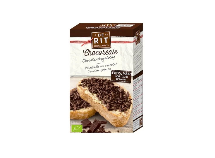 Onze biologische chocoladehagel is lekker voor op de boterham, maar ook ijs, yoghurt of een ander dessert krijgen een feestelijk tintje met de Rit Chocoreale chocoladehagel. Deze pure chocoladehagel bestaat voor ten minste 32% uit cacao.