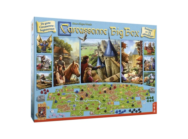 Carcassonnepakket met het basisspel en maar liefst 11 uitbreidingen in het nieuwe artwork! Hiermee kun je oneindig variëren. Het speelmateriaal past praktisch in de doos, waardoor je alles altijd gemakkelijk bij de hand hebt.