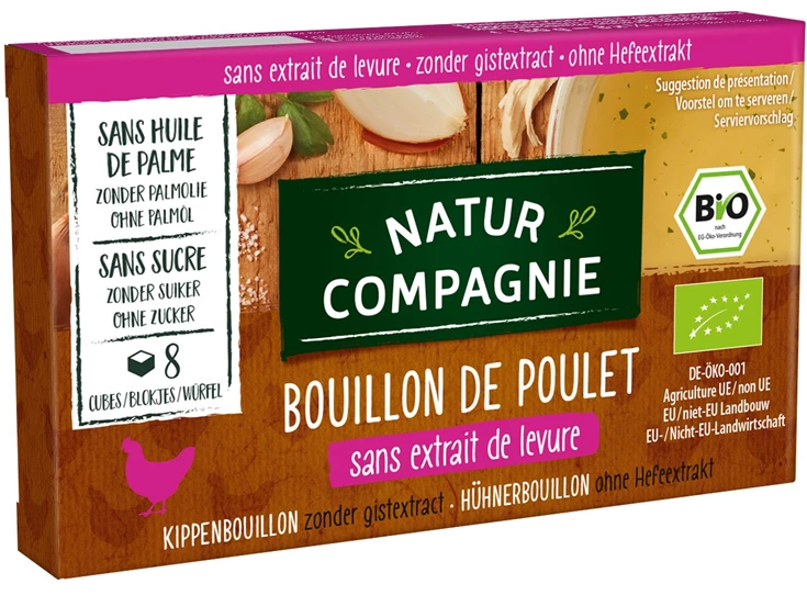 Ingr.: Zeezout, maïszetmeel, sheaboter, kippenvleespoeder 11%, kippenvet 3,8 %, gevogeltebouillon (kalkoenkarkas, kippenkarkas, gevogeltevet), uien, selderij, wortel, curry (kurkuma, peper, koriander, kaneel, hoornklaverzaad, komijn, kardemom, gember, paprika, piment, nootmuskaat, kruidnagel), kruiden (peterselie, rozemarijn), knoflook.