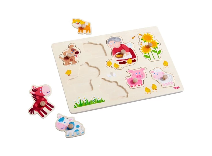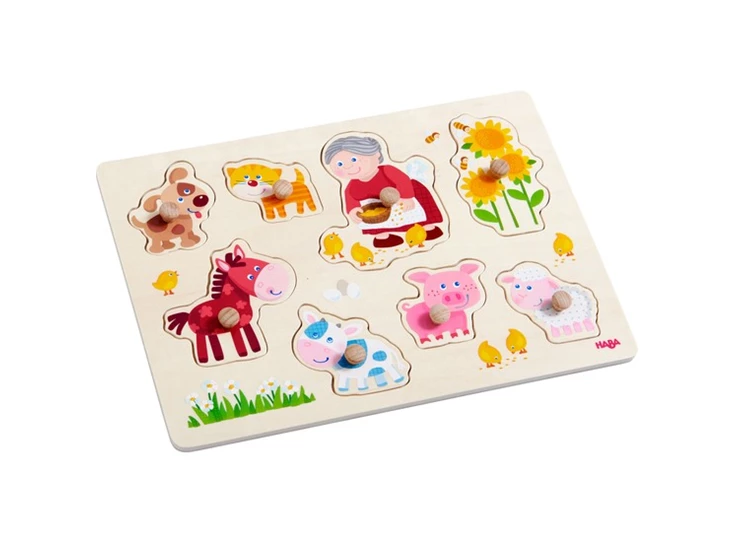 Waar horen het paard, het schaap of de koe? Bij deze hoogwaardige inlegpuzzel kunnen de kleinsten hun favoriete dieren stuk voor stuk in het puzzelbord leggen. De grote, gemakkelijk te grijpen knoppen helpen hierbij.