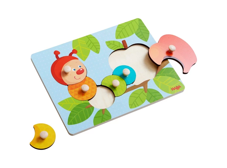 Nou, wie kruipt daar uit die appel? Met de 6 puzzelstukken kunnen kleine puzzelvrienden de schattige, kleurrijke rups Mina vormen. Een goed begin om te leren puzzelen!