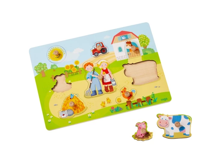 Op de boerderij valt er heel wat te ontdekken: de grappige dieren, de boer en de boerin, de leuke rode trekker … en dat allemaal onder de stralende zon. Dankzij de grote, gemakkelijk te grijpen knoppen kunnen de puzzelstukken goed worden vastgenomen.