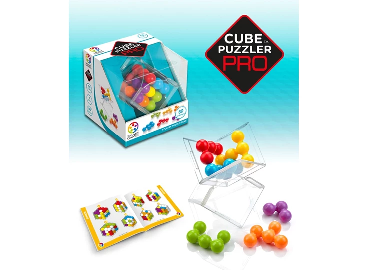Transparente kubus die dient als opbergdoos en spelbord! 6 kleurrijke balvormige puzzelstukken, boekje met 80 opdrachten en oplossingen.