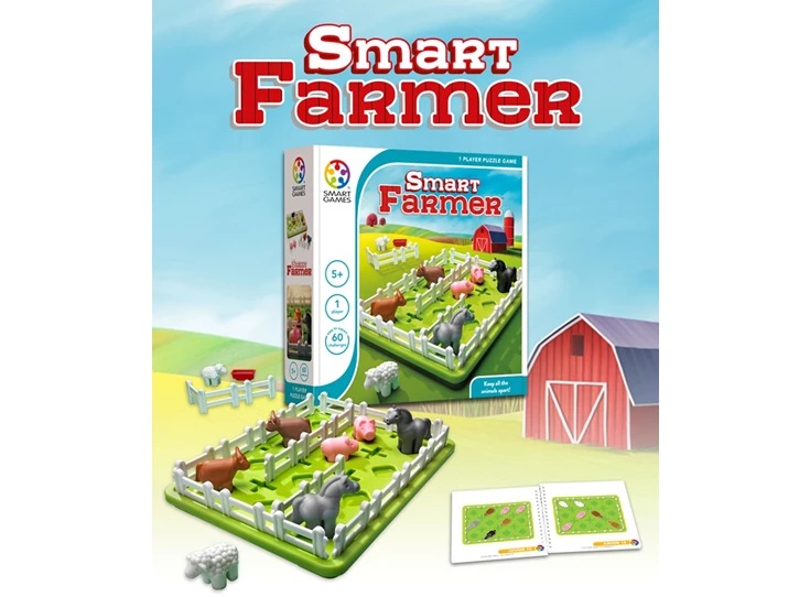 Spelbord met 4 vaste hekken, 2 paarden, 2 koeien, 2 schapen, 2 varkens, 3 water troggen, 3 hekken, boekje met 60 opdrachten en oplossingen.