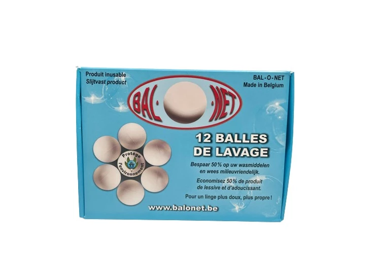 Door hun mechanische werking kloppen de Bal-O-Net wasballen het wasgoed uit zoals de wasvrouwen dat vroeger deden. U bespaart: u gebruikt slechts 50% van uw wasmiddel (poeder of vloeibaar) en 50% of minder van uw wasverzachter. Bal-O-Net breekt alle kalkresten in het diepste van uw wasgoed en u hebt slechts de helft wasmiddel en wasverzachter nodig. Uw wasmachine slijt minder, uw was is zachter dan tevoren, u bespaart en u beschermt de natuur! Plaats simpelweg 12 balletjes in de trommel samen met uw wasgoed. Beschikbaar in pak van 12 balletjes.