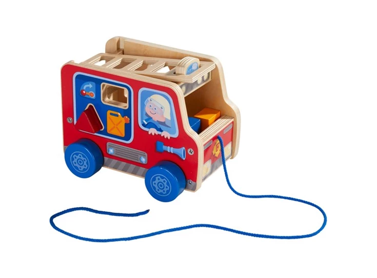 Ta-tu, ta-tu, daar komt de brandweer! Het voorttrekken van deze leuke brandweerauto stimuleert kinderen om te kruipen en te lopen. Bovendien kunnen de kleinsten hun motoriek verder ontwikkelen, door de kleurrijke houten stukken passend aan te brengen.