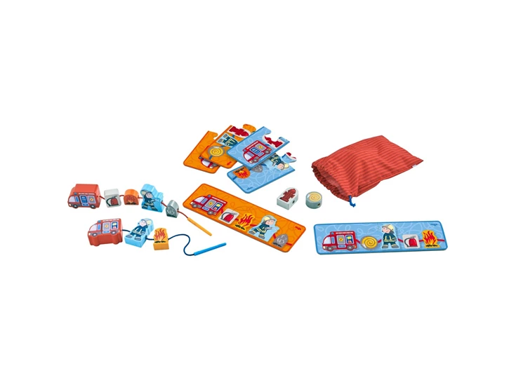 2 brandweerauto’s met rijgsnoer, 2 brandweermannen, 1 groot brandend vuur, 1 klein brandend vuur, 1 gedoofd vuur, 1 brandkraan, 1 brandblusser, 1 brandslang, 4 opgavenkaarten (2-delig, aan beide kanten bedrukt), 1 voelzakje, 1 handleiding.