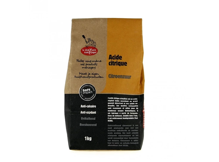 Citroenzuur is een van de meest voorkomende plantaardige zuren, wordt gevonden in alle organismen als een product van het metabolisme. De mogelijkheden zijn divers: een additief in het bakpoeder en in de cosmetische en farmaceutische producten, smaakstof in dranken en voedingsmiddelen, ontkalker voor koffiezetapparaten, wasmachines, etc.. Traditionele drogisterij producten worden verdund in water. Antibacteriële, schimmeldodend, sterk anti-kalksteen (ontkalking van koffiezetapparaten, waterkokers, wasmachines, roestvrij stalen oppervlakken, chroom, keramiek, plastiek, ...) Beschikbaar in papieren zak van 1 kg.