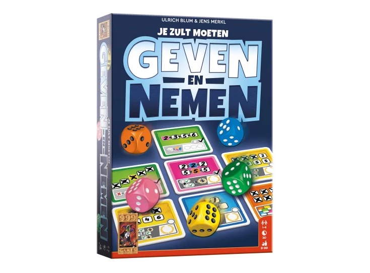 In dit dobbelspel probeer je de door jouw geworpen dobbelstenen slim in te zetten om een zo hoog mogelijke score te behalen. Tot zo ver niets nieuws toch? Bij Geven & Nemen heb je echter geen standaard scorevel, maar maak je dat zelf door in jouw beurt een van de kaarten van tafel te kiezen. Zo stellen alle spelers in de loop van het spel hun eigen, unieke speelveld samen. Kies de juiste combinatie van kaarten om je score te maximaliseren.