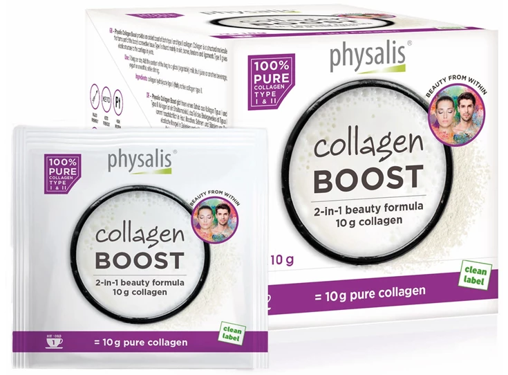 Ziet je huid er soms minder glad uit en mist hij zijn natuurlijke uitstraling? Tijd om de zaak van binnenuit aan te pakken! Physalis Collagen Boost is een 2-in-1 instant mix van goed opneembare peptiden uit collageen type I (Naticol®, mariene oorsprong), dat deel uitmaakt van het bindweefsel (huid, botten, pezen en ligamenten) en geeft tegelijkertijd een boost van collageen type II (Collavant® n2), dat structuur geeft aan het elastisch kraakbeen in gewrichten. Jouw geheime wapen om de dag stralend en sterk door te komen!