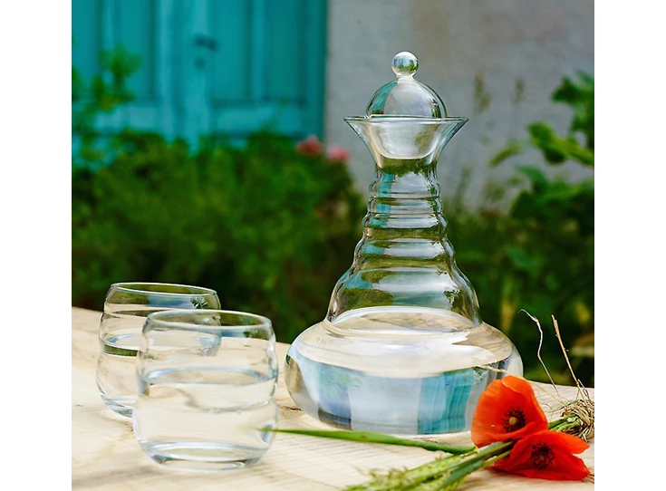 De karaf “Alladin” is de basisversie in een serie van karaffen. De “Alladin” met de gouden Levensbloem op de bodem is al vele jaren een van de meest gewilde kannen. De trapsgewijze opzet van 6 opeenvolgende secties, met het volume van elke sectie volgens een van de eerste 6 nummers van de universele Fibonacci-reeks, komt overeen met de geometrie die overal in de natuur te vinden is. Gerevitaliseerd water vertoont een 6-zijdige kristalstructuur die overeenkomt met een verhoogde mate van energie en levenskracht.