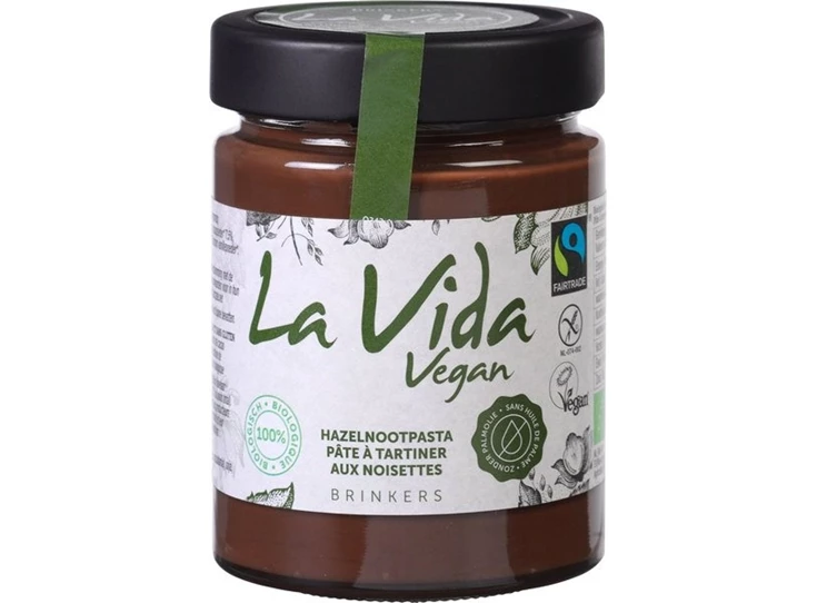 Deze hazelnoot chocoladepasta is biologisch, Fairtrade, veganistisch, glutenvrij, palmvrij en zonder soja.