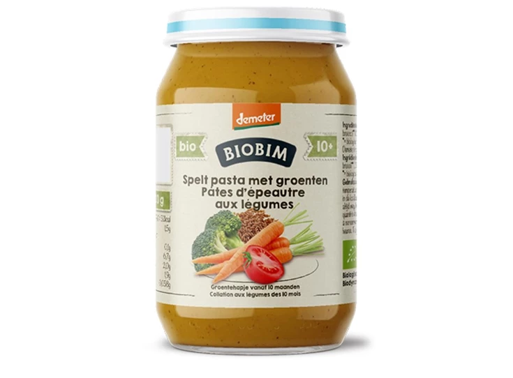 water, spelt pasta gekookt** (22%), wortel** (21%), broccoli**, tomaten puree** (11%), koolzaadolie* *=biologisch **=biologisch-dynamisch