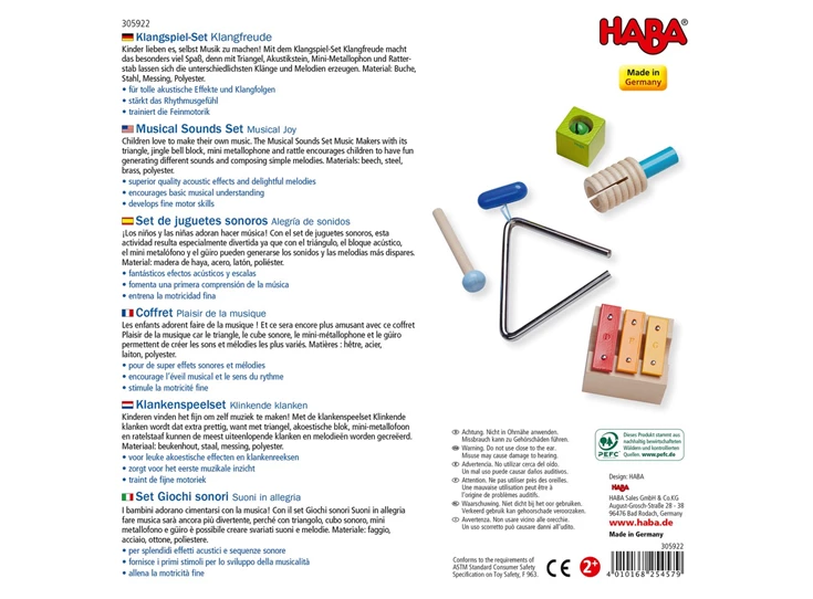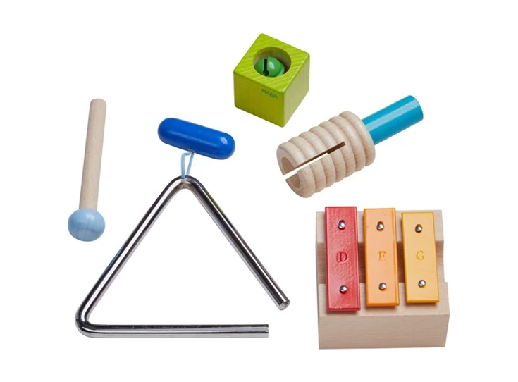 Inhoud: 1 triangel, 1 akoestische steen (met belletje), 1 mini-metallofoon, 1 ratelstaaf, 1 trommelstok.
