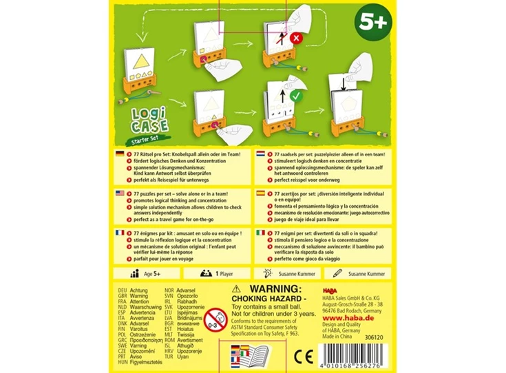 Kleurrijk, uitdagend, afwisselend - dat zijn de LogiCASE-raadselsets. Het doel is om de meest uiteenlopende opdrachten te ontgrendelen en op te lossen. De speler kan zijn/haar antwoord zelf controleren met de houten pin. Kan men de kaart eruit trekken of niet? Dit versterkt de motivatie en vaardigheid om een probleem zelfstandig op te lossen. Is een raadsel opgelost? Dan wacht de volgende uitdaging al! Met de LogiCASE-uitbreidingssets kunnen de starterssets eenvoudig en flexibel worden uitgebreid op basis van thema en moeilijkheidsgraad. Zo blijft het altijd spannend!