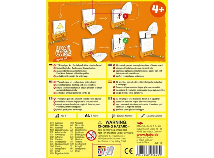 Kleurrijk, uitdagend, afwisselend - dat zijn de LogiCASE-raadselsets. Het doel is om de meest uiteenlopende opdrachten te ontgrendelen en op te lossen. De speler kan zijn/haar antwoord zelf controleren met de houten pin. Kan men de kaart eruit trekken of niet? Dit versterkt de motivatie en vaardigheid om een probleem zelfstandig op te lossen. Is een raadsel opgelost? Dan wacht de volgende uitdaging al! Met de LogiCASE-uitbreidingssets kunnen de starterssets eenvoudig en flexibel worden uitgebreid op basis van thema en moeilijkheidsgraad. Zo blijft het altijd spannend!