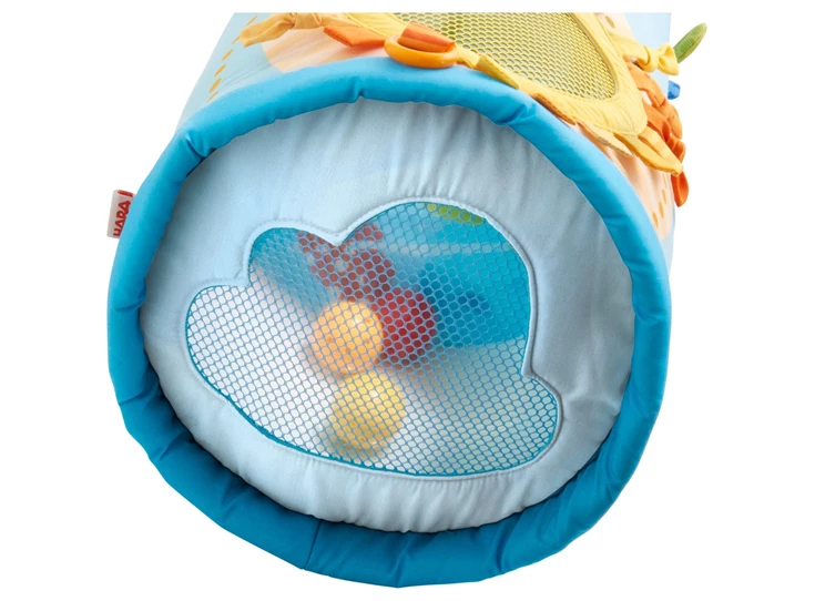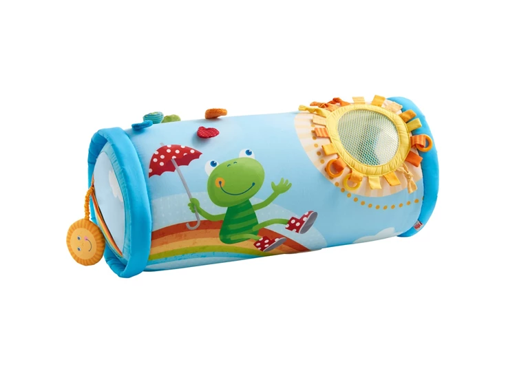 De kruiprol Regenboogwereld brengt baby’s in beweging. Ze kunnen de met lucht gevulde rol van zich wegrollen, erachteraan kruipen en daarbij heel veel ontdekken: zichzelf in de grote spiegelfolie, verschillende knisper- en voeleffecten, veel om te betasten en te leren kennen, om mee te spelen en zich over te verwonderen. De talloze details stimuleren en fascineren kleine ontdekkers en al hun zintuigen.