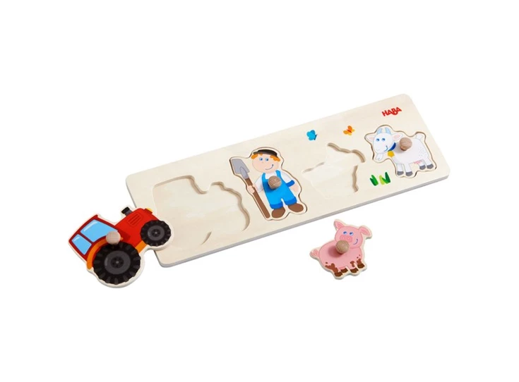 Welkom op de boerderij! Waarmee rijdt de boer op zijn veld? En welk dier wentelt zich graag in de modder? Met deze hoogwaardige inlegpuzzel leren de kleinsten al spelend het landleven kennen. Voor een snel puzzelsucces zorgen de grote houten stukken met gemakkelijk te grijpen knoppen.