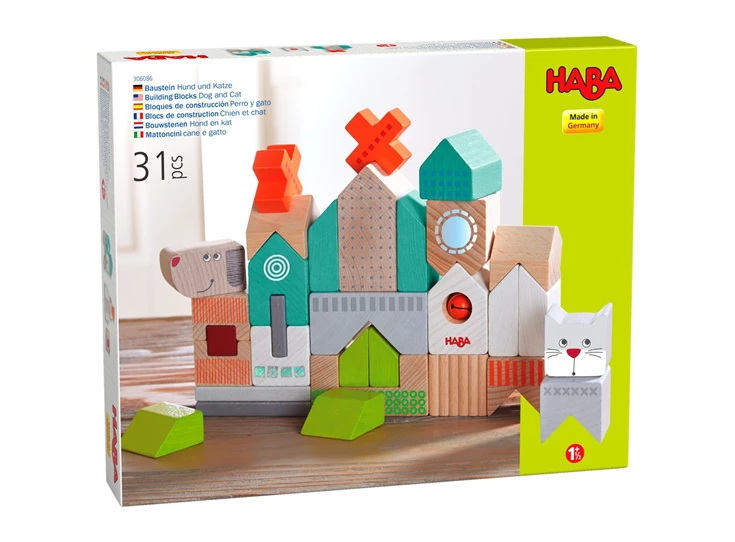Kleine bouwmeesters, let op! Tussen de bouwstenen zitten een snoezige kat en een schattige hond verstopt voor beestachtig stapelplezier! Steen na steen ontstaan kleurrijke en kunstzinnige bouwsels, die telkens weer kunnen worden veranderd. Haast vanzelf ontplooien zich de creatieve talenten, terwijl al spelend ook het driedimensionale denken wordt bevorderd.