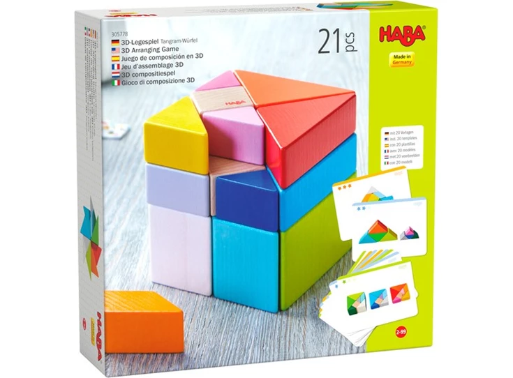 Deze kubus heeft het in zich! Hij bestaat uit kleurrijke stenen, die naar de basisvormen van een tangram gemaakt zijn. Als deze slim tegen en op elkaar worden gelegd, ontstaan de meest uiteenlopende geometrische figuren. En met de talloze combinatiemogelijkheden – naar een voorbeeld of volledig vrij – groeit ook het experimenteerplezier van de kleine stapelkunstenaars!