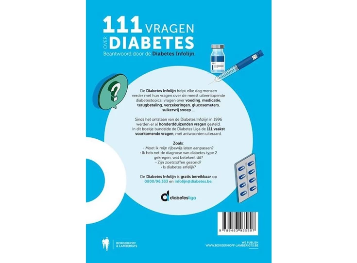 De gratis Diabetes Infolijn helpt elke dag mensen verder met hun vragen over de meest uiteenlopende diabetestopics: vragen over voeding, medicatie, terugbetaling, verzekeringen, glucosemeters, suikervrij snoep... Sinds het ontstaan van de Diabetes Infolijn in 1996 werden er al hondderduizenden vragen gesteld. Bij de 20ste verjaardag van de Diabetes Infolijn bundelde de Diabetes Liga de 111 vaakst voorkomende vragen, mét antwoorden uiteraard, in dit boekje. Zoals: Moet ik mijn rijbewijs laten aanpassen? Ik heb net de diagnose van diabetes type 2 gekregen, wat betekent dit? Zijn zoetstoffen gezond? Is diabetes erfelijk?
