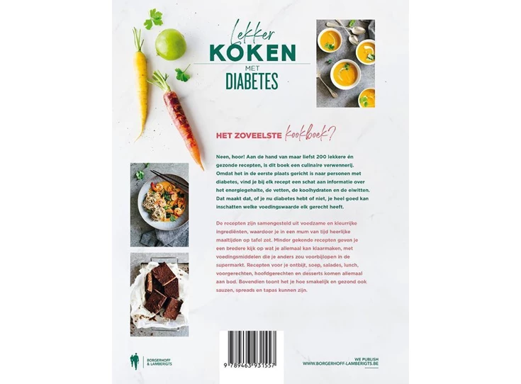 type 1 (ontstaat bij kinderen of jongeren) of type 2 (treedt op op latere leeftijd). Dat zijn meer dan een miljoen Belgen die hun levenswijze moeten aanpassen. Onderdeel daarvan is een bepaald voedingsdieet volgen. Voor al die mensen is er dit kookboek – maar bij uitbreiding hebben ook alle andere mensen er baat bij om de recepten uit dit boek te proberen. Uiteindelijk zijn ze goed voor ons aller gezondheid én zijn ze nog lekker ook. Handig uitgesplitst in ontbijten, lunches en avondmaaltijden. En omkleed met alle nuttige voedingsdeskundige info.