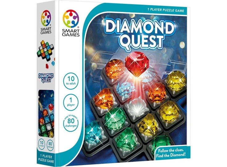 Volg de aanwijzingen en vind de rode diamant! Daal af in de SmartGames diamantmijn en graaf alle juwelen op. Gebruik de ‘mijn’ van informatie aangeboden door de hints en aanwijzingen in elke uitdaging om de locatie van de rode diamand te achterhalen. Hoe dieper je graaft, hoe meer je deductievaardigheden worden getest! Diamond Quest is een uniek puzzelspel met 80 uitdagingen, van makkelijk tot expert.