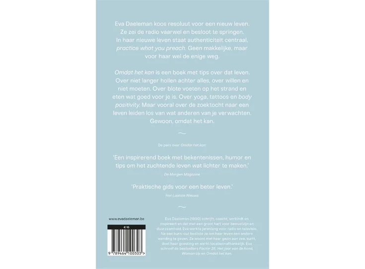 Eind 2017 koos Eva Daeleman resoluut voor een nieuw leven waarin authenticiteit de sleutel is: practice what you preach. Geen makkelijke weg, maar voor haar wel de enige weg. Dit boek is een praktische gids voor het leven. Over niet langer hollen achter je leven, over willen en niet moeten. Over blote voeten op het strand en eten wat goed voor je is. Over yoga, tattoos en body positivity. Maar vooral over de zoektocht naar een leven leiden los van wat anderen van je verwachten.