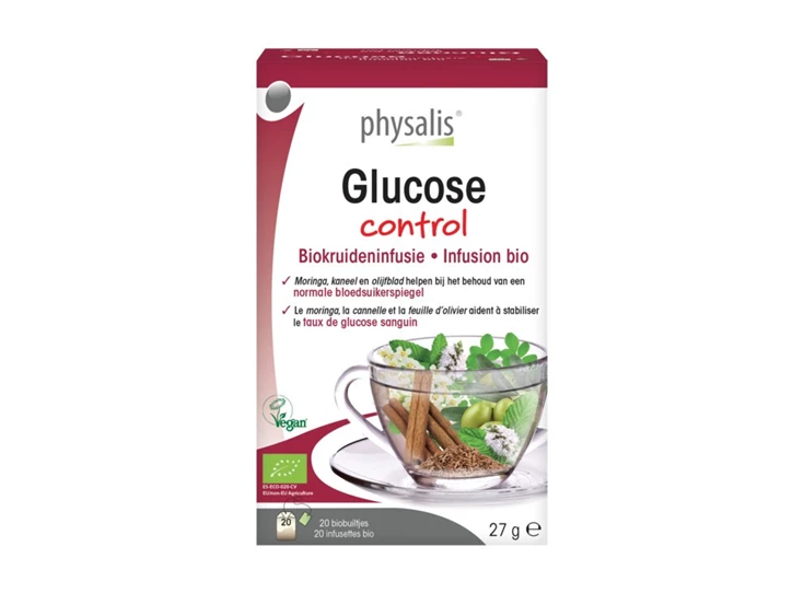 Beweging en een aangepast dieet zijn de belangrijkste stappen om een gezonde bloedsuikerspiegel te behouden. Bepaalde planten kunnen hierbij ook ondersteuning bieden. Physalis Glucose control biokruideninfusie bevat moringa, kaneel en olijfboom die helpen bij het behoud van een normale bloedsuikerspiegel. Fenegriek draagt bij tot een normaal glucose- en insulinemetabolisme. Zacht en aangenaam van smaak.