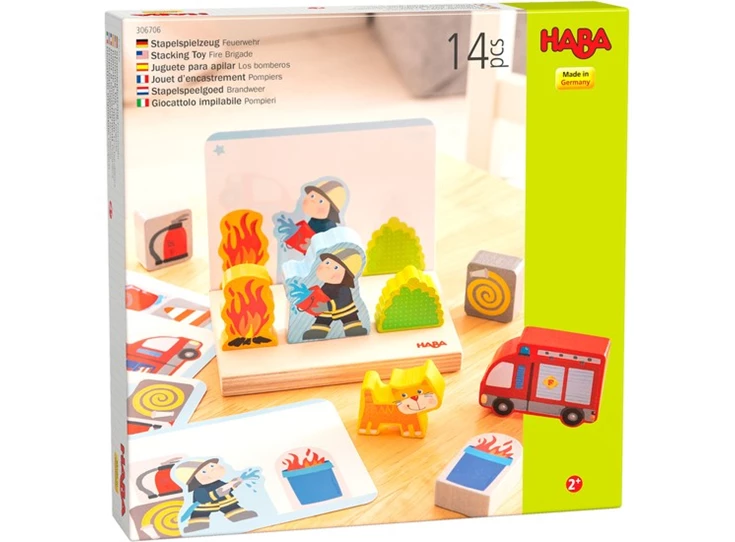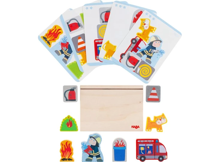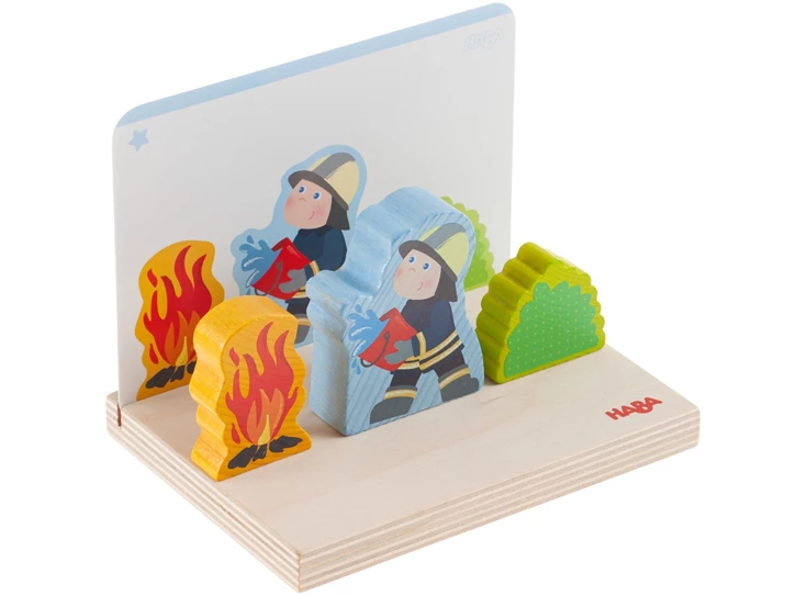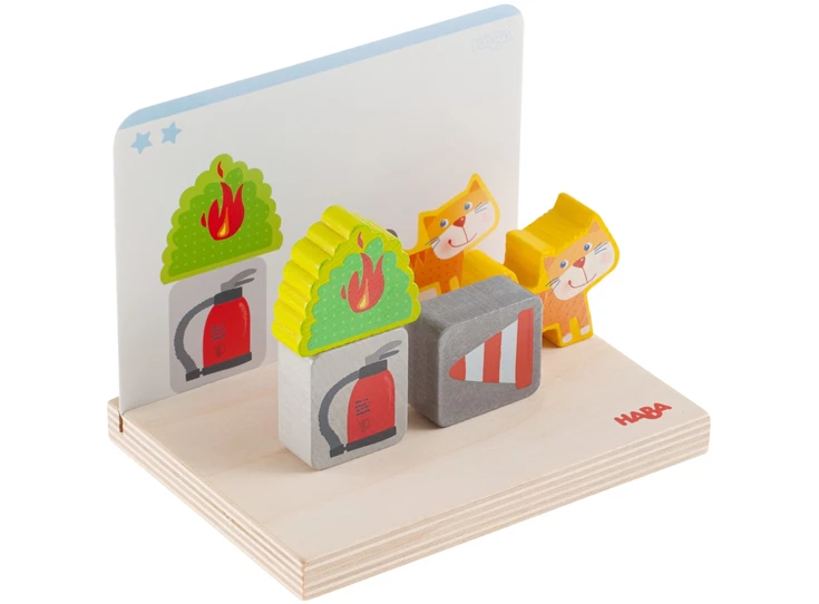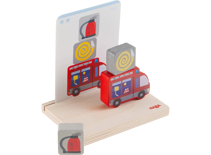 Brand! Brand! Snel uitrukken en alles opstellen! De brandweerman en andere figuren kunnen telkens weer anders op de basisplaat worden geplaatst en gestapeld. Er kan zowel vrij als volgens de voorbeelden met verschillende moeilijkheidsgraden worden gestapeld. Waterkraan open en blussen maar!