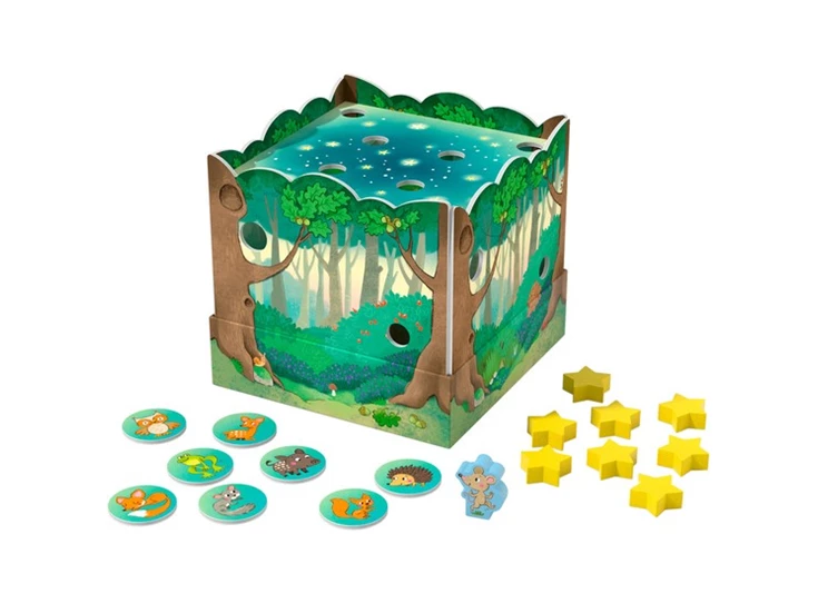 Inhoud: 1 speelfiguur Mia Muis, 3D-bosdecor, 8 houten sterren, 8 dierenkaartjes, 1 handleiding.