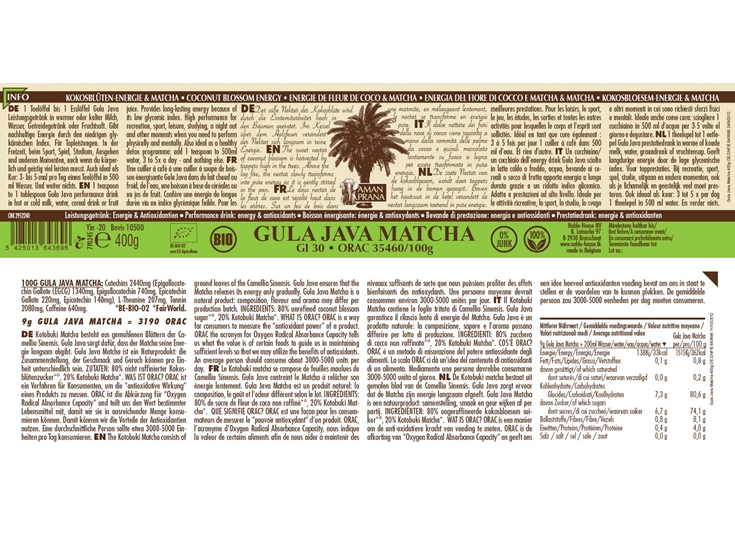 Gula Java Matcha: De voedingsspecialisten bij Amanprana combineren Gula Java met matcha. Matcha is een Japanse ceremoniële groene thee. Amanprana kiest voor de Kotobuki kwaliteit. Deze wordt door kenners geprezen om zijn pure smaak en hoge voedingswaarde. Kotobuki is sterk en bevat meer gezonde tanines. Je dagelijkse portie anti-oxidanten in 1 kopje Gula Java. Geeft langdurig energie doro de lage glycemische index.