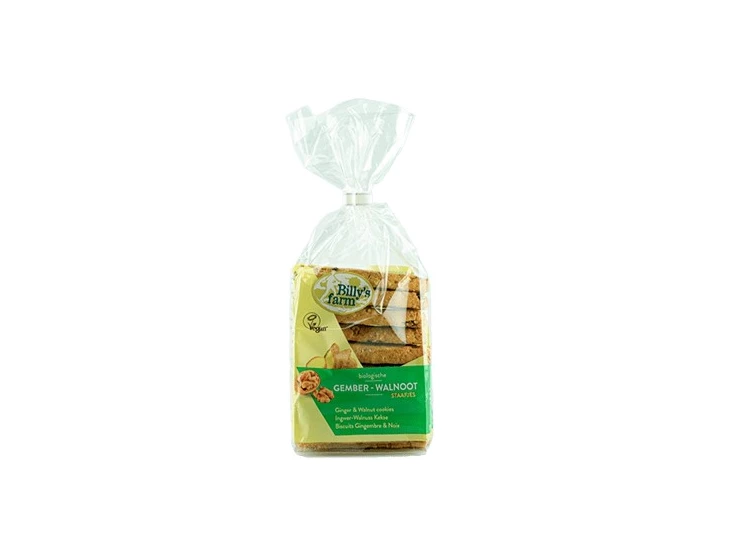 Volkoren SPELTmeel [TARWE]* 40%, Palmolie*, Mais*, Gerstmoutsiroop*, HAVERvlokken*, WALNOTEN* 4%, Rozijnen*, Gemberkruiden* 2%, Rijsmiddel (Natrium Bicarbonaat), Zout, * = Biologisch