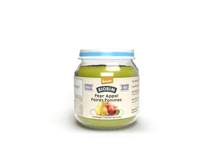 Dit potje van Biobim bevat een zeer fijn gepureerd fruithapje van biologisch-dynamische appels en biologisch-biologische peren.