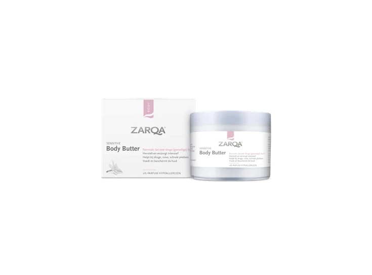 ZARQA Body Butter is een intensief verzorgende crème die de droge, geprikkelde en (zeer) gevoelige huid voedt en beschermt. Ruwe huid, schrale plekken en schilfers worden weer zacht en glad. Het kalmeert de huid en trekkerigheid verdwijnt. Het herstelt de verstoorde vochtbalans en de natuurlijke beschermingslaag van de huid. Verzacht bij kloofjes. Geschikt voor het hele gezin.