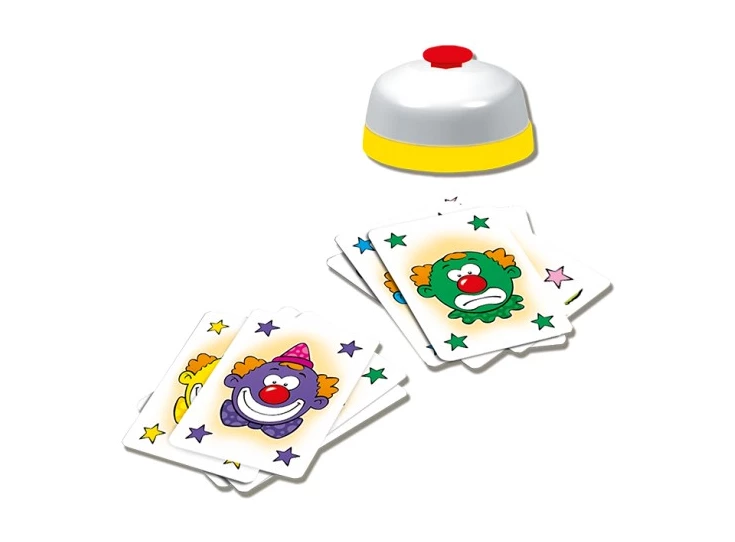 De juniorversie van het succesvolle spel met de bel. Reageer snel zodra je twee dezelfde lachende clowns ziet. Wie verzamelt de meeste kaarten?
