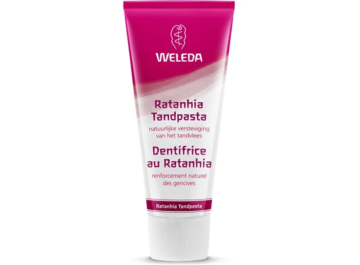 Ratanhia Tandpasta maakt het tandvlees sterk en stevig en trekt het samen rond de tandwortel, zodat de tanden vaste wortel kunnen houden. Bij goed poetsen met Ratanhia Tandpasta krijgt tandplak geen kans. Met zachte mintsmaak.