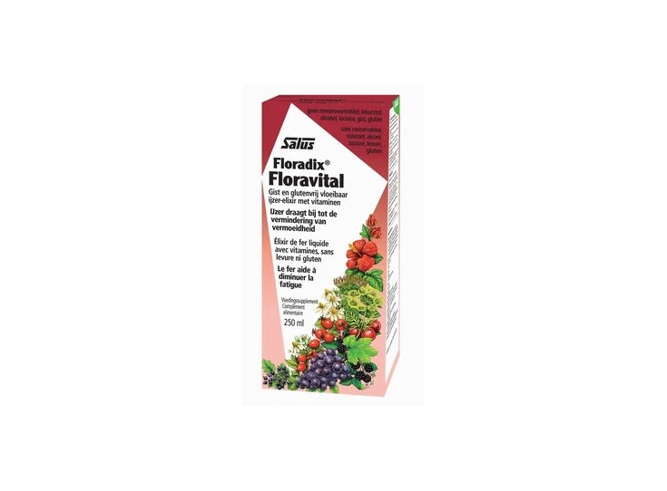 Floravital is een vloeibaar ijzer-elixir aangevuld met groente-extracten en vruchtenconcentraten.