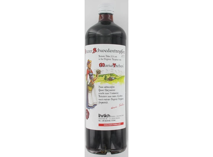 Kruiden van Maria Treben (absint, engelwortel, aloë, myrre, safraan, senne, rabarber, kamfer, zitterwortel, Venetiaanse Theriak, zilverdistel),, alcohol 32% vol.