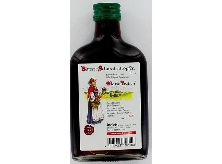 Kruiden van Maria Treben (absint, engelwortel, aloë, myrre, safraan, senne, rabarber, kamfer, zitterwortel, Venetiaanse Theriak, zilverdistel),, alcohol 32% vol.